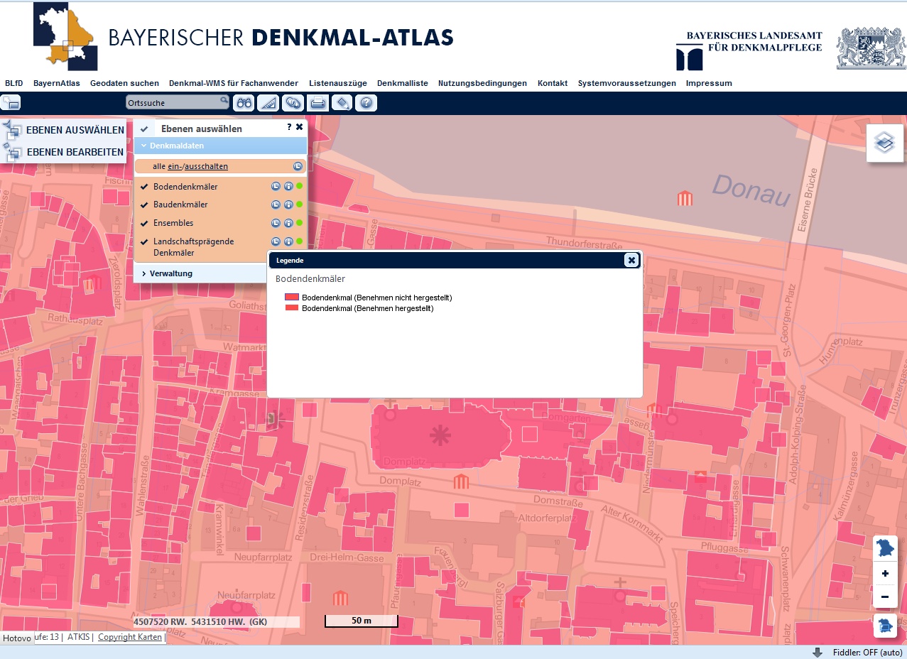 Poučná je struktura zobrazených „témat“ . Tedy nezávisle si v legendě (vlevo nahoře) můžeme zapínat Bodendenkmäler (tj. archeologické památky) Baudenkmäler (stavební), Ensembles (soubory) a Landschatsprägende Denkmäler (v zásadě předchozí s širším vlivem na krajinu???).